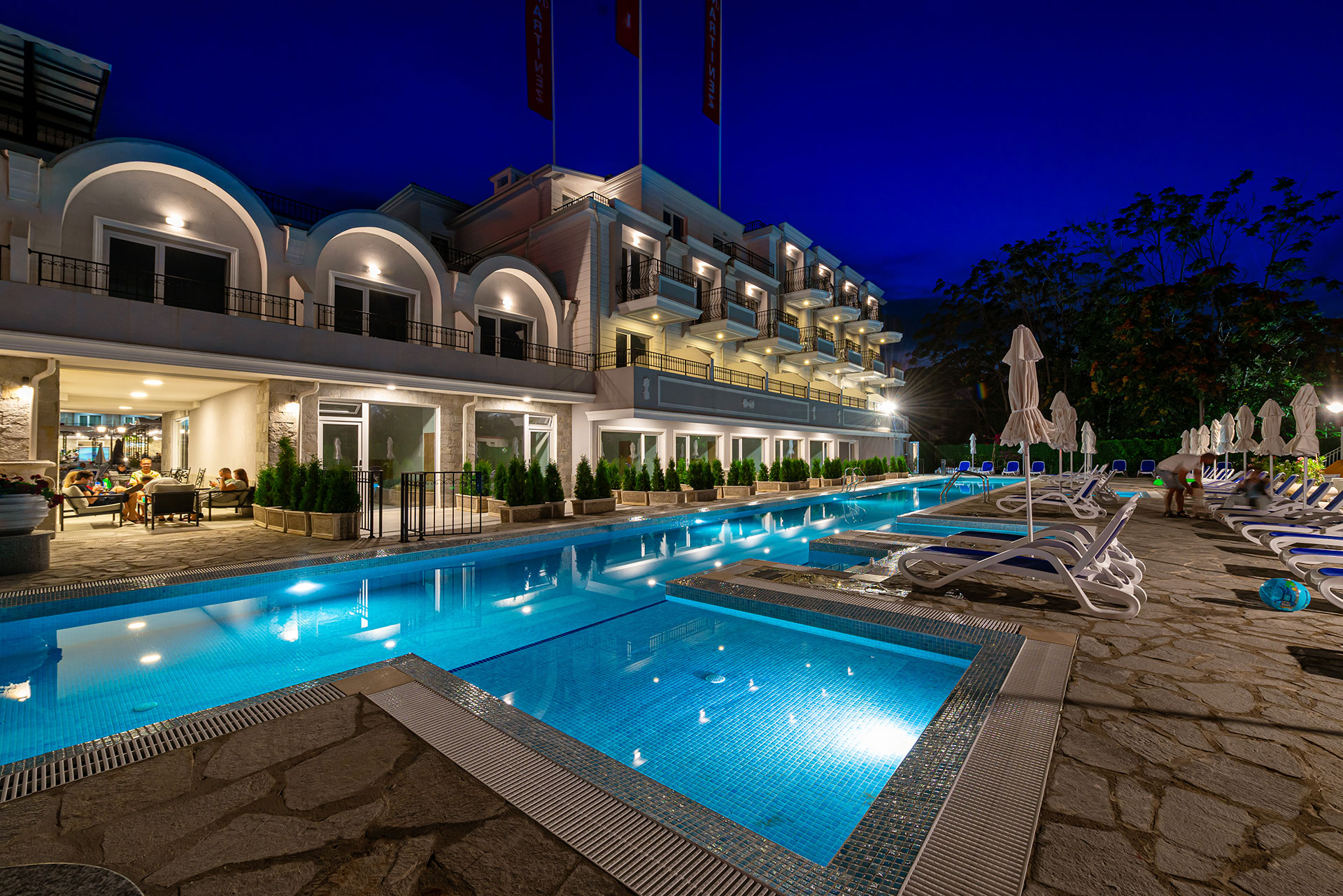 2 открити басейна- единият е крушообразен и се простира на 300 кв.м с дълбочина 120-140 см, другият е дълъг 50 м и широк 4 м с дълбочина 1.45 см, като към него са приспособени 2 бр. джакузита- безплатени