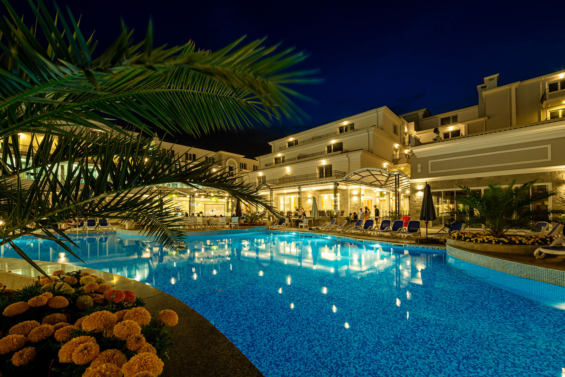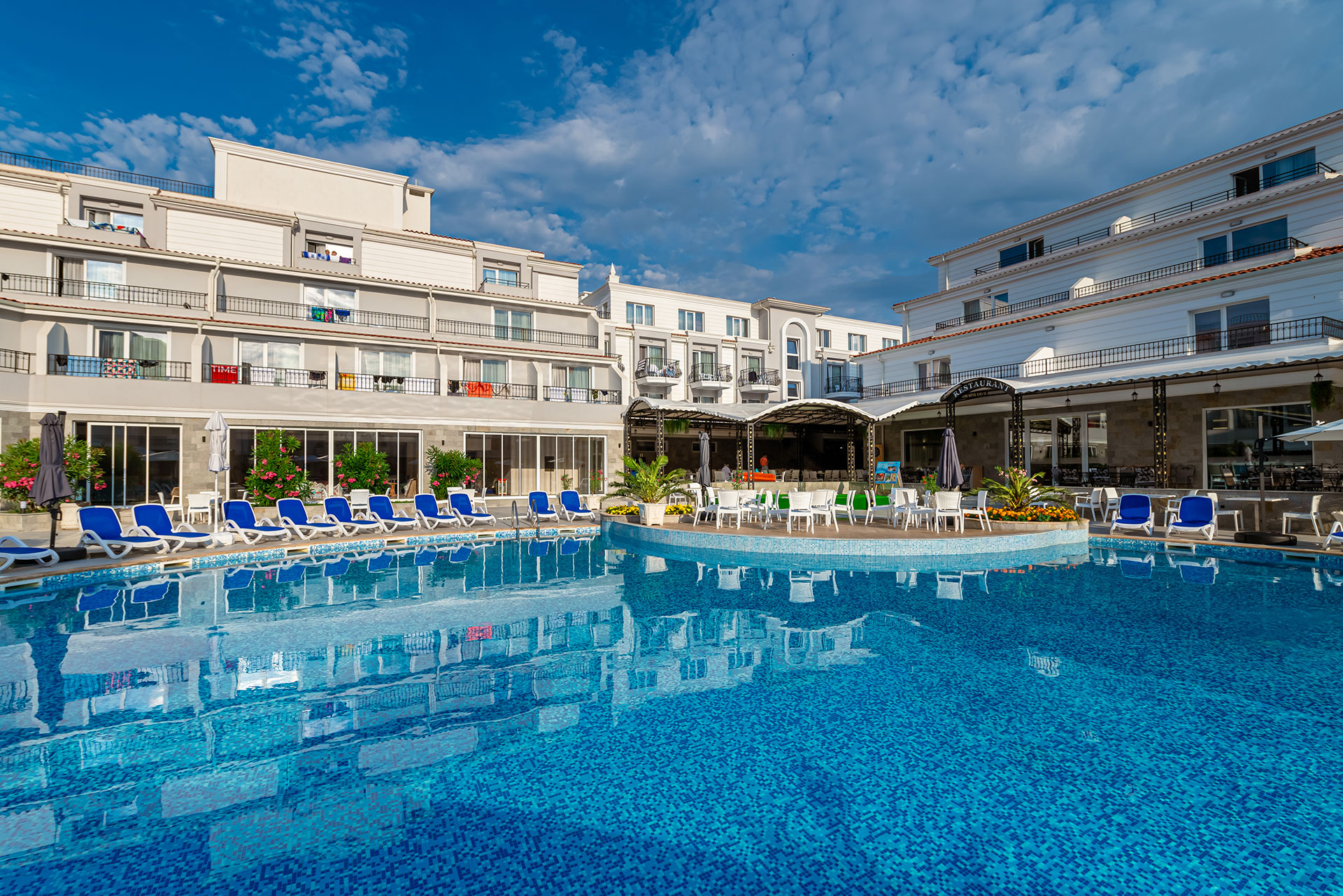 Зоните около басейните разполагат с 100 чадъра и 200 шезлонга за гостите на хотела